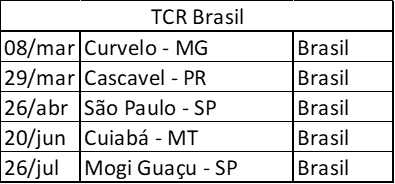 O Calendário de Provas da TCR 2026 é composto por cinco etapas no Brasil, quatro na Argentina e uma no Uruguai. O campeonato é disputado inicialmente em cinco cidades brasileiras – Curvelo (MG), Cascavel (PR), São Paulo (SP), Cuiabá (MT) e Mogi Guaçu (SP). Essa primeira parte define o campeão da TCR Brasil, enquanto o total das dez provas nacionais e internacionais disputadas ao longo do ano determinam o vencedor da TCR South America.